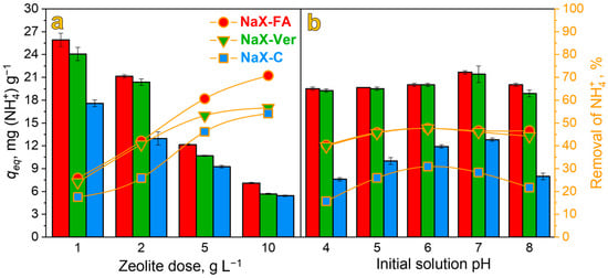The key factors that guide the adsorption process are the adsorbent dose and initial solution pH. In Figure 5a,b, the results of those operating conditions are compared. As can be seen, with an increase in the zeolite dose from 1 to 10 g L−1, the adsorption capacity drops with a simultaneous increase in the removal of NH4+ ions. The efficiency of adsorption was strictly dependent on both zeolite dose and zeolite type. As the zeolite dose increased from 1 to 10 g L−1, the removal of NH4+ ions increased from 25.9, 24.0, and 17.5% to 70.8, 56.6, and 54.2% for zeolites NaX–FA, NaX–Ver, and NaX–C, respectively. This was a result of the increasing number of active sites with the increasing zeolite dose []. The most dynamic ramp in the percentage removal of ammonium ions was observed when the dose increased from 1 to 2; however, a further increase in the zeolite dose from 5 to 10 g L−1 had a rather weak effect for zeolites NaX–Ver and NaX–C, which were close to saturation. For further analyses, the zeolite dose 2 g L−1 was selected as optimal to obtain the balance between both sufficient adsorption capacity of 21.1, 20.4, and 13.0 mg (NH4+) g−1 and percentage removal of 42.2, 40.6, and 25.9 % for NaX–FA, NaX–Ver, and NaX–C, respectively.