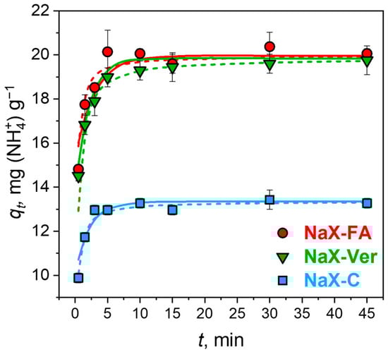 As the solution pH increased from 4 to 7, the adsorption capacity increased and reached the maximum at pH 7 for all samples. Next, for a pH of 8, a noticeable drop in adsorption capacity was observed in all zeolite–adsorbate systems. It can be thus assumed that suitable pH conditions for the removal of ammonium ions from aqueous solutions vary from 6 to 7 (maximum % removal of NH4+ ions at pH 6–47.6, 47.7, and 30.9 % for zeolites NaX–FA, NaX–Ver, and NaX–C, respectively). Such a phenomenon can be also found in the literature, and it implies that the adsorption of ammonium ions is most favorable in the pH range from about 5 to 7 []. Lower adsorption capacities at a pH below 6 are explained by the competition of H3O+ ions with NH4+ ions in acidic conditions []. At a pH below 5, the zeolitic structure can collapse, which implies the importance of this operating parameter in adsorption []. On the other hand, at a pH above 8, the ammonia–ammonium ions equilibrium shifts toward the formation of ammonia, which can also lead to a drop in adsorption capacity []. Hence, a pH of 7 was selected for further investigations.