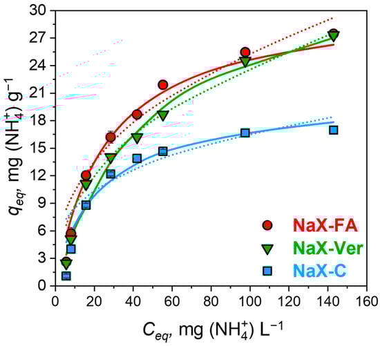 In this study, Langmuir and Freundlich’s static models were employed to fit the adsorption isotherms. The graphical visualization of the results is presented in Figure 7. As the ammonium ion concentration increased, the equilibrium adsorption capacities increased rapidly. It can be also found in the literature [] that, with increasing concentration of ammonium ions in the solution, the adsorption rate also increases. As can be seen in Table 5, both models correlated with the experimental data; however, the Langmuir model displayed a greater correlation R2 > 0.98 for all zeolite–adsorbate systems. Such a phenomenon implies monolayer adsorption on a homogenous surface and that adsorbate has an equal affinity to active sites. The calculated values of qmax increased in order: 21.05 > 38.46 > 40.00 mg g−1 for zeolites NaX–C, NaX–Ver, and NaX–FA, respectively. From the Freundlich model, the 1/n parameter was calculated and its value varied from 0.314 to 0.507, implying that adsorption was favorable in all systems [,]. Zeolites NaX–FA and NaX–Ver exhibited comparable adsorption properties toward ammonium ions, whereas zeolite NaX–C was significantly less efficient. The values of Freundlich (KF) and Langmuir (KL) constants appeared not to follow the same order. In the case of zeolite NaX–C, the KL constant was higher (0.034 L mg−1) than for zeolites NaX–FA (0.021 L mg−1) and NaX–Ver (0.017 L mg−1), whereas the KF constant decreased in order NaX–FA > NaX–Ver > NaX–C, which, in fact, reflects the adsorption capacity. This phenomenon can be a result of the different energy of adsorption resulting from the type of material and the effect of the presence of carbon within the zeolite NaX–C []. The obtained results are compared with the literature data in Table 6.