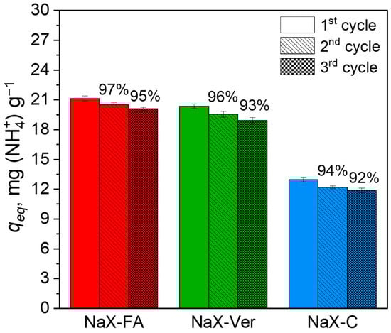 Zeolite NaX–FA, in general, poses rather exposed active sites and NH4+ ions are rapidly able to occupy the adsorption sites []. Small NH4+ ions (~0.331 nm) can be easily transferred through the zeolite pores, improving the adsorption rate [,].