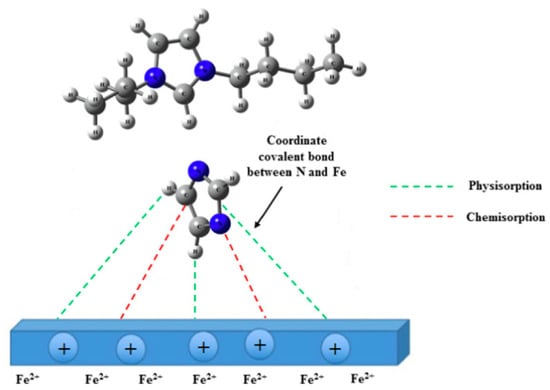 The alkyl chain has a great influence on the corrosion inhibition performance of the molecule. In some carboxylic acid derivatives, the length of the alkyl chain is a major corrosion inhibition factor [25,26]. Milošev showed that alkyl chains alone cannot be used as corrosion inhibitors, and carboxylic acid groups are needed as anchoring groups [27]. El-Haddad [28] explored the corrosion inhibition performance of imidazole derivatives with and without alkyl groups for aluminum in 0.5 M HCl. Their results revealed that the corrosion inhibition efficiency of methyl imidazole was better than that of imidazole. The methyl substituent did not affect the mechanism of action of the imidazoline but increased the coverage and adsorption of the compound on the aluminum surface. Additionally, the adsorption obeyed the Frumkin adsorption isotherm. In the study by M. Ontiveros-Rosales, it was found that the completely adsorbed IBPI3 structure was similar to that obtained by the cluster model, and that the cationic and anionic parts were T-shaped. The single N of the imidazole salt part was perpendicular to the iron surface, the mechanism of which is provided in Figure 2 [25]. Therefore, in this section, we focus on discussing N-heterocycles as anchoring groups and the effect of alkyl substituents with different chain lengths on the corrosion inhibition performance of N-heterocycles. The main chemical structures are shown in Table 1, in which the number of nitrogen atoms in the ring is sorted from less to more, that is, following the order of the five-membered ring, six-membered ring and fused-ring heterocycle.