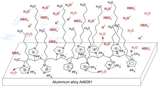 Due to the hydrophobicity, N-heterocyclic corrosion inhibitors with long alkyl chains are somewhat limited in use due to their solubility. The advent of ionic liquids (ILs) has solved the solubility problem and become an excellent alternative in the field of corrosion inhibitors [42,43,44,45,46,47]. Ionic liquids are generally divided into a cationic part and an anionic part, and an alkyl group is generally used as a modified part of the cation. Feng et al. [24] studied three anionic corrosion inhibitors, 1-vinyl-3-methylimidazolium iodide ([VMIM]I), 1-vinyl-3-propane-1-vinyl imidazolium iodide ([VPIM]I) and 1-vinyl-3-butyl imidazolium iodide ([VBIM]I), in a 0.5 M sulfuric acid solution for X70 steel. Similarly, Qiang et al. [29] compared the corrosion resistance of ethyl, butyl, hexyl, and octyl-modified 3-position 1-allyl-imidazole bromide to copper. For the above-mentioned systems, the corrosion inhibition efficiency increased with an increase in the alkyl chain length. In Arelanes-Lozada’s study, the polarization resistance value (Rp) indicated that PImC12, with the longest alkyl chain length, formed the most dense film on the surface. Compared with the aliphatic chain lengths of other PILs, the effective arrangement of PLmC12 had the greatest protection capability on the metal surface shown in Figure 3 [30]. Cao et al. [31] explored the inhibition efficiency of ILs ([(CH2)COOHMIm][HSO4], [(CH2)2COOHMIm][HSO4]) for carbon steel in a 0.5 M HCl solution. It was found that ionic liquids can improve the solubility of imidazole rings, and N-heterocyclic parent cations and anions can be adsorbed on metal surfaces as active adsorption sites. The inhibition efficiencies of the above ILs increased with the augment of the alkyl chain length attached to the imidazolium ring, and their favorable performance was ascribed to the formation of IL adsorption films. Moreover, due to the covalent bond formed by charge transfer or sharing and electrostatic attraction, ILs were mainly chemisorbed onto the metallic surface. The longer alkyl chain yielded a stronger interaction of the studied ILs and a larger coverage area on the metal, forming a denser protective film to reduce aggressive attacks.