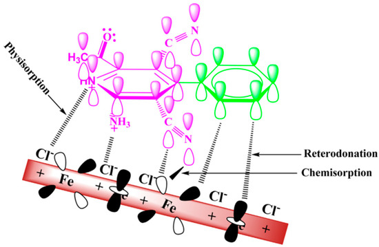 Regarding pyridine derivatives, Tebbji [55] studied the corrosion inhibition effect of pyridine-pyrazoles(P1, P2) with different substituents(-CH2OH and -COOC2H5) in HCl for steel. The high inhibition efficiency was explained by the presence of three nitrogen atoms, and electrons of the pyridine and pyrazole ring were the major adsorption centers for their interaction with the metal surface [65]. The difference was attributed to the presence of an electron-donating group (CH2OH) of P1 and an electron-withdrawing group (COOC2H5) of P2 by the mesomeric effect to change the density of the molecule. It was found that the substituents did not significantly change the corrosion inhibition mechanism of the main body but did affect the corrosion inhibition efficiency (P1 > P2). Ansari [43] evaluated the influence of -H, -CH3 and -OCH3 on the corrosion inhibition performance of compound PC, finding that the electron-donating group reduced the corrosion resistance of the compound instead. It is worth mentioning that the adsorption on the solid surface is not purely physical or chemical, as illustrated in Figure 4. First, the chemical adsorption of PCs arose from the donor–acceptor interactions between free electron pairs of heteroatoms and π-electrons of multiple bonds as well as the phenyl group and vacant d-orbitals of irons [66,67]. The second was physical adsorption from charged metal surfaces to charged PC molecules. Furthermore, the adsorption of chloride ions on the positively charged metal surface generated an excess negative charge, and the positively charged (PCsH+) adsorbed on the metal surface through electrostatic interaction and formed a protective layer [68,69]. Finally, to release the extra negative charge from the mild steel, the electrons from the d orbital of Fe may be transferred to the empty p* orbital of the PC molecule, thereby enhancing the adsorption on the surface of the mild steel. The above adsorption was closely related to the overall electronic structure of the inhibitor molecule.