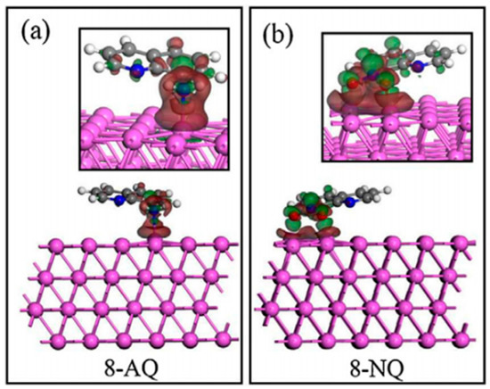 Among the quinoline derivatives, Wang [59] studied the effect of the electron-donating amino group and the electron-withdrawing nitro group on their corrosion inhibition properties. For 8-AQ, its interaction with Al (1 1 1) was through the amino group (Figure 5a), while the interaction between 8-NQ and Al (1 1 1) was through the O atom of the nitro group (Figure 5b). The corrosion inhibition efficiency was 8-NQ > 8-AQ. From the DFT calculation, the electron-donating group (-NH2) allowed the charge accumulation region to be biased towards Al atoms, while 8-NQ, with the electron-withdrawing group (-NO2), had a bias towards O atoms, which were N and O atoms that provided lone pairs of electrons to form coordination bonds with Al atoms. The above adsorption was performed by the substituent connected to the parent; therefore, the substituent played a vital role in the corrosion inhibition process of the compound.