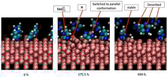 The adsorption behavior and corrosion inhibition mechanism of C2-halogenated derivatives of imidazole (2-I-Imz, 2-BrImz and 2-Cl-Imz) on an Fe(100) surface were studied by Ismail Abdulazeez et al. [71]. Electrochemical tests demonstrated that the steady-state corrosion potential was in the order of 2-I-Imz > 2-Br-Imz > 2-Cl-Imz, with the adsorption energies of the Fe(100) surface being −3.98, −3.76 and −3.48 eV, respectively, indicating that the thermodynamic stability of the surface film and the corrosion inhibition properties increased following the same order. This was attributed to the ability of the dissociated halogen substituents to bind to the Fe2+ on mild steel. As the concentration increased, the coverage of the iron surface increased. The facile dissociation and strong adsorption of 2-I-Imz suggested its potential as an excellent corrosion inhibitor relative to imidazoles and other halogenated imidazoles. During the adsorption process, the parallel conformation of the molecule was more stable due to the large adsorption area with the metal, and the inclined conformation was kinetically unstable in Figure 6, mainly because the C-halogen bond was easily broken. The dissociated product was strongly bound to the iron surface, thus enabling the formation of a strong adsorption layer with properties that depended on the halogen–metal interaction. However, the dissociated Cl− and Br− corroded by exchanging with the oxygen in the metal-protective oxide film. More pitting damage occurred on the metal surface, with chloride showing the most damage.