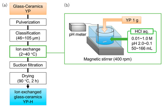The abovementioned ion exchange of polycrystalline Na/K β/β″-Al2O3 was carried out by soaking in hot H2SO4. However, we employed dilute hydrochloric acid as the exchanging medium for gradual exchange. To evaluate the conditions for ion exchange, such as concentration of HCl aqueous solution and immersion period of solids, ball-milled and screened powders of glass-ceramics with a size of 46–105 μm in diameter were first subjected to ion exchange experiments (Figure 1a,b); the powders of 1 g were immersed in 50–166 mL HCl solution with various concentrations of 0.01 to 1.0 mol L−1 for 30 d (Figure 1a,b). The samples before and after ion exchange were named YP and YP-H. The ion exchange rate was determined by monitoring the pH of the solution (Equations (1)–(3)). The temperature effect of ion exchange was also evaluated according to the same manner mentioned above.