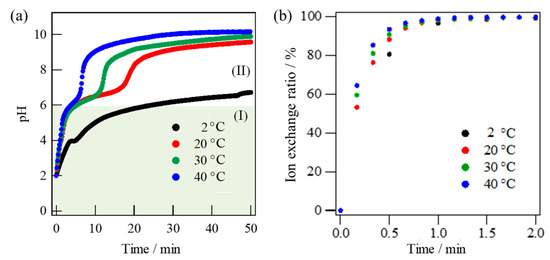 The monitored pH change of the solution with immersion time indicates that the ion exchange proceeded more rapidly from pH = 2 to an alkaline region up to pH = 10 via a two-step processes at a higher temperature without structural destruction (Figure 5a). Based on the result of Figure 5a, the ion exchange ratio was calculated using Equation (1). The evaluated result is shown in Figure 5b. It was also noted that the ion exchange was completed within a few minutes at the first step I, even at a low temperature of 2 °C (Figure 5b). Possibly the second step II was considered to give rise to a slight surface corrosion, because the surface morphology was seen to be roughened by scattered pores (Figure 4d,e).