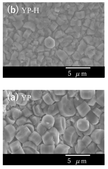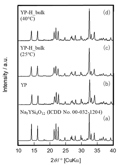 The surfaces of bulk glass-ceramic specimens thus treated exhibited no considerable change after ion exchange by SEM observation (Figure 7a,b), and XRD analysis confirmed the no destruction of the Na5RSi4O12-type structure (Figure 8a–d). However, as the longer time treatment at 25 °C gave mechanical damage to specimens, the temperature of 60 °C was chosen for the preparation of hydronium bulk glass-ceramics.