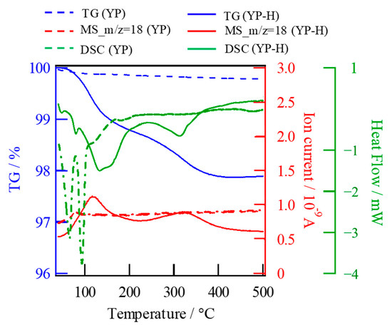 Endothermic peaks on HCl-untreated specimens were observed at 64.1 and 91.9 °C, and the total weight loss was within 2%, while the peaks were detected at 133.3 and 312.6 °C in addition to 47.6 and 79.6 °C on ion-exchanged ones (Figure 9). All peaks observed below 100 °C were attributed to evaporation of adsorbed water on surfaces. However, the endothermic peaks at 133.3 and 312.6 °C on ion-exchanged specimens are deduced to the evaporation of ion exchanged hydrated water from the inner bulks. The amount of water loss as protons from the bulk specimen was evaluated as 0.794 mol per 1 mol of glass-ceramics by TG analysis, while the mobile Na+ concentration was calculated as 0.622 mol per 1 mol of glass-ceramics by comparison of specimen’s weight with chemical formula. The consistency of the two values with each other within the experimental error indicates the one-to-one exchange of Na+ of a glass-ceramic with H+ of HCl solution.