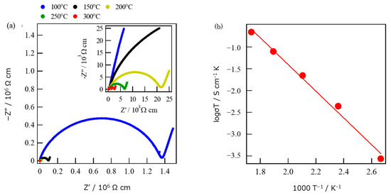The measured complex impedances are shown as an Arrhenius plot, where a single semicircle was observed at each temperature (Figure 10a,b). The result indicates that the separation of grains and grain boundaries-conductions were inseparable, and then the measured conductivities (σ) corresponded to the total of the two microstructural elements. The value of σ at 300 °C was 3.8 × 10−4 Scm−1 with the activation energy of 58.6 kJ mol−1 for the most conductive bulk specimen. There are two main types of proton transfer: Grotthuss type and Vehicle type. In the Grotthuss type, a proton becomes H3O+ when it receives an electron supply from an unpaired electron in the presence of water and can move by hopping against an unpaired electron on a neighboring water molecule when there are enough neighboring water molecules. In this case, the proton conduction can be achieved with a low activation energy because it does not require much energy for translational motion. On the other hand, in the Vehicle type, protons are given unpaired electrons by water molecules to become H3O+, and then they form a group and perform translational motion to conduct protons. A large amount of activation energy is required for the translational motion [22]. The proton transfer in crystallized glass after carrier ion exchange is considered to be of the Vehicle type due to the high activation energy. Although the conductivity of glass-ceramics decreased in the order of 10−2 Scm−1 by ion exchange of Na+ with H3O+, the value of σ of ion exchanged glass-ceramics can still be anticipated to be on the level of practical applications with further efforts. Because the microstructure of glass-ceramics strongly depends upon annealing time and temperature of nucleation and crystal growth, we are investigating the effects of those parameters on improvement of conduction properties.
