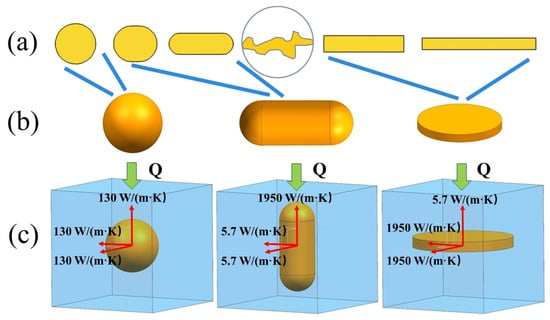 Despite that the macroscopic thermal conductivity of cast iron is isotropic, the contribution of graphite with different anisotropy is still unclear. The unit cell model can consider the anisotropy of the dispersed phase, which is a method to simplify the composites into a representative volume element (RVE) composed of phases with different thermal conductivity. The thermal conductivity of RVE, that is, the effective thermal conductivity of the composites, can be calculated by the thermal resistance network method []. Wang et al. [] studied the effect of microstructure on the effective thermal conductivity of gray cast iron by establishing the unit cell model containing cross-shaped anisotropic graphite, which realized macroscopic isotropy in three main directions. It proved the feasibility of the unit cell model in the study of thermal conductivity of cast iron. To extend this approach to VGI, the complex shape of vermicular graphite needs to be simplified first, which can be solved by simple shape interpolation. Different growth rates of graphite along [1010] (a-axis) and [0001] (c-axis) determine the morphology of graphite. When the growth rate of the a-axis is much faster than that of the c-axis, it is easy to grow into flake graphite; when the growth rate of the a-axis is close to that of the c-axis, it is easier to grow into spherical graphite; while vermicular graphite is in between []. Therefore, if several simplified graphite models with topological equivalence [,] are established according to the 2-D and 3-D morphological characteristics of three types of graphite and the ratio of the a-axis and c-axis, it is believed that the real vermicular graphite will be included. Finally, the effect of interface between graphite and matrix is not also negligible on thermal conductivity of VGI [,].
