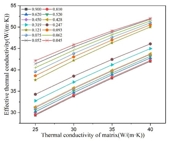 Figure 6 shows the effect of thermal conductivity of matrix on effective thermal conductivity of cast iron, where v is 5%. The effective thermal conductivity of cast iron increases linearly with the thermal conductivity of matrix increases. At the same time, the slope of linear change decreases with the decrease of graphite shape parameter, which corresponds to the analysis in Section 3.2.3.
