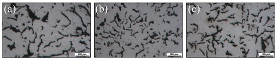 Two-dimensional morphology of graphite in (a) specimen 1, (b) specimen 2 and (c) specimen 3 [].