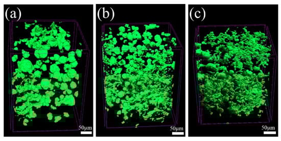 Three-dimensional morphology of graphite in (a) specimen 1, (b) specimen 2 and (c) specimen 3.
