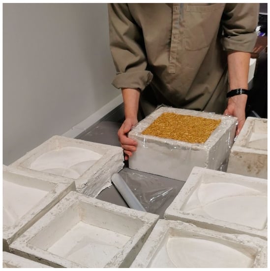 The first stage in producing all MBC samples was to prepare gypsum molds that would allow multiple pieces of the same shape to be obtained. Afterwards, the molds were thoroughly cleaned and isolated with a polyethylene film. The next step was adding a substrate into the molds and fungus inoculum. Once the molds were filled with the mycelium-infected substrate, they were sealed with another sheet of a polyethylene film. This film was punctured to allow for airflow to the growing fungus. The humidity levels and mycelium growth were closely monitored daily.