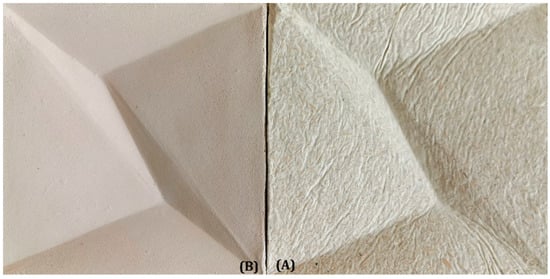 Elements of the wall cladding (size: 20 cm × 20 cm): (A) wall cladding made of MBCs; (B) wall cladding made of chamotte clay (photo by A.B.).