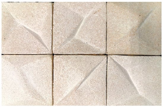 On the fourth day of growth, the top film was removed to allow for primary drying, and the fungus maturation continued. On the fifth day, the mycelium grew to fill the mold, and drying was conducted to inactivate the fungus. The molds filled with the substrate to produce MBC samples used in test C are shown in Figure 2. As mentioned, in test C, fired unglazed chamotte clay cladding panels were used as reference samples. These reference samples before firing are shown in Figure 3.