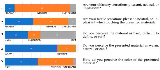 However, observing the correlation between questions 2 and 4, 32 respondents rated tactile sensations as positive, 12 respondents declared that they simultaneously perceived the material surface as soft, 12 respondents perceived it as neutral, and 6 respondents perceived it as hard. Therefore, the asset of the material is its “softness”. The correlations between responses to questions 4 and 2 and between questions 4 and 3 indicated that the respondents valued “warm” and “soft” materials.