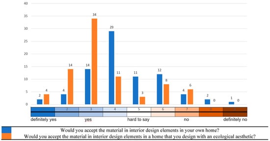 Question 1, worded in this way, required expressing one’s personal opinion about the material, with positive answers indicating a significant positive reception. The second question, on the other hand, referred to the respondent’s general opinion regarding using the material. The results of test B demonstrated that the respondents’ acceptance of the MBC was high, especially with homes designed by the respondents in ecological aesthetics. The result of each respondent was a preference profile from rank 1 = “definitely yes” to rank 9 = “definitely no”. As shown in Figure 9, the respondents significantly associated the MBC with ecological solutions. However, it is interesting that the respondents did not necessarily associate their homes with environmentalism. Staying eco-friendly is important, but it seems not at one’s own home.