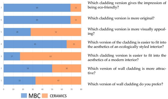 This study expressed preferences for pairwise comparisons, leading to ranking the cladding type by answering seven questions. General responses when following the method of pairwise artifact comparison of wall cladding samples revealed the advantage of ceramic material, mainly regarding the overall assessment (question 1 in test C) and visual appeal (question 5 in test C). The respondents also believed that the chamotte clay cladding would be easier to fit into the aesthetics of a modern interior, which would be better with its style (question 3 in test C). The results of the research are presented in Figure 10. At the same time, mycelium-based composites (MBCs) were clearly perceived as a more attractive and original solution (questions 2 and 6 in test C). It also gives the impression that being eco-friendly and definitely would fit and enhance an ecologically styled interior (questions 4 and 7 in study C).