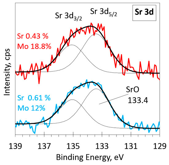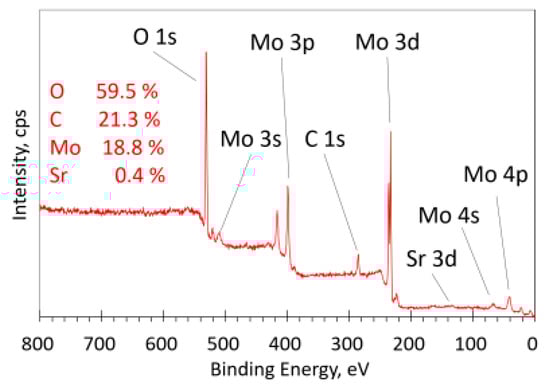 A comparison of the oxygen XPS spectra in the O 1s region for some samples is shown in Figure S5 (Supplementary Materials). The deconvolution of the spectra for these samples revealed a similar structure consisting mostly of a peak at approximately 530.5 eV, which represents oxygen bound to molybdenum (530.5 eV) or oxygen bound to strontium (530.4 eV) [11,12]. A small amount of typical atmospheric contaminants (C-O and H-O bonds) [11,12,14] was also detected.