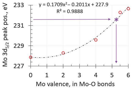 In order to further elucidate the valence of molybdenum, a simple curve approximation procedure (employing MS Excel software) was used. Initially, a graph (Figure 4) was constructed to represent the relationship between the molybdenum valence state and Mo 3d5/2 peak energy values (red circles) [11,12]. Then, all the points in the graph were used to draw an approximation curve (Figure 4, dashed line). Afterwards, the acquired binding energy of the fitted Mo 3d5/2 peak (Figure S3) was used to define the valence state of molybdenum (Figure 4, the violet arrows and asterisk on the curve). The relative concentrations of Mo bonds for all the samples calculated from spectra deconvolution are presented in Table S1 in the Supplementary Materials.