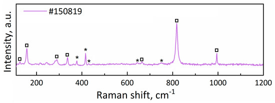 The analysis of Raman spectra revealed that sample #150819 exhibited pronounced peaks corresponding to the MoO3 phase [15,16], as indicated by the squares in Figure 6 and Figure S6. The most intense bands at 994 cm−1 and 818 cm−1 corresponded to Mo-O stretching modes [16], whereas other peaks marked with squares in the spectra can also be attributed to different Mo-O vibrations as indicated in Ref. [17].