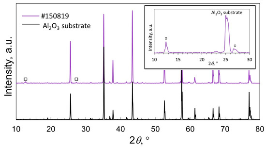 The XRD patterns of sample #150819 and the Al2O3 substrate are shown in Figure 7. The XRD patterns indicated the presence of the MoO3 phase, as marked by the squares in Figure 6. The two peaks exhibited (020) and (040) Bragg reflections, and this was attributed to the orthorhombic structure of α-MoO3 according to the powder diffraction data (JCPDS card no. 05-0508). As for the rest of the samples (see the Supplementary Materials), they were found mostly in an amorphous state.
