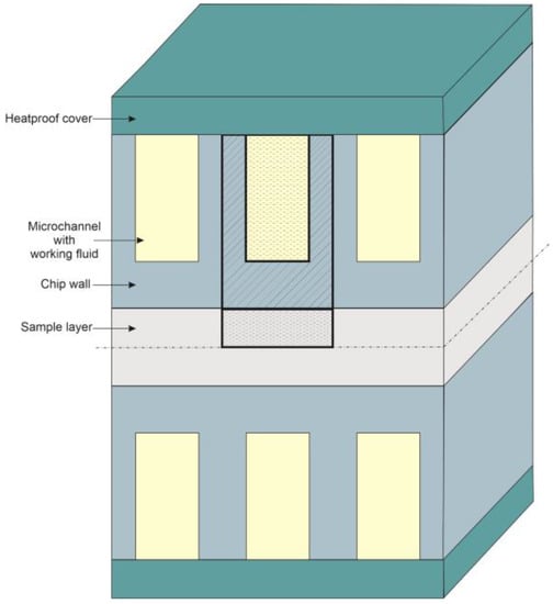 In this research, a microfluidic system with microchannels is modelled. The design is created according to the geometry proposed by Tuckerman and Pease [39] and Zhou et al. [8]. The central part of the system consists of microcavities, in which a thin layer of solution with a biological sample is placed. The relatively small thickness of the sample achieved by the microfluidic construction promotes a regular temperature distribution inside. This layer is surrounded by a casing in which microchannels are extruded. Placed in this element is the working fluid that regulates the rate of cooling.