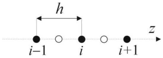 Firstly, a time grid with a constant step Δt and a geometrical mesh with a constant step h are introduced. Figure 3 presents the concept of a three-points star, which is applied to create the geometrical mesh.