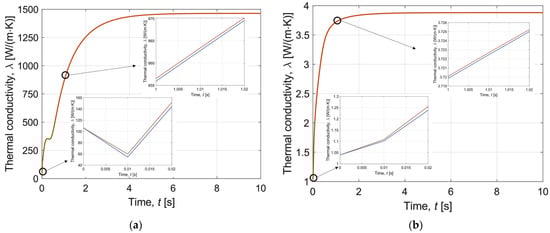 Firstly, Figure 4 and Figure 5 present the interval thermal conductivity and the interval specific heat as a function of time, respectively. Diagrams with enlarged sections have been prepared for both the chip wall made of silicone and the sample layer (water and EG solution). These curves clearly indicate that the thermophysical parameters are temperature-dependent and change during the simulation. Therefore, it is reasonable to introduce them in the form of a function. In addition, it is the thermal conductivity and the specific heat for both the chip wall and the sample layer that are the interval numbers in the model. The deviation from the value estimated from Equations (18) and (19) is equal to 5% ( and ).