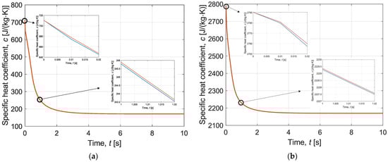 Specific heat coefficient as a function of time during cooling for (a) chip wall; (b) sample layer.