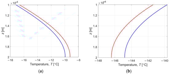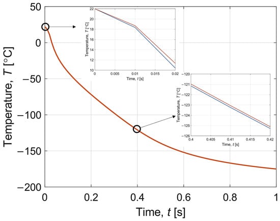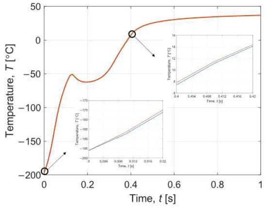 The results in Figure 6 demonstrate the interval temperature changes during cooling at a point located in the central part of the sample layer (z = Hw + Hs). The width of the interval is relatively small; hence, an approximation is prepared for 0–0.02 s and 0.40–0.43 s, which confirms that the resulting temperature course is in the form of intervals. Note that the red line and the blue line represent the upper and lower limits of the interval, respectively. It can be seen that stabilisation of the temperature to the assumed temperature by working fluid is achieved within a few seconds. In the whole sample, the minimum temperature is reached after 14.1 s.