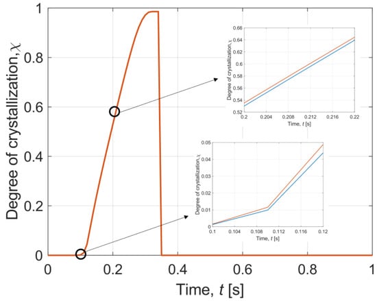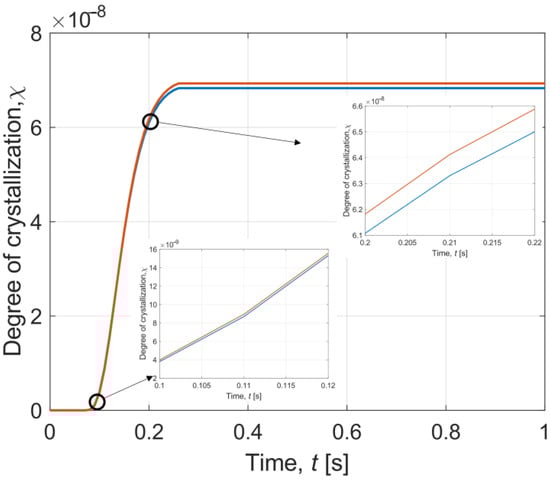 The results obtained are also compared with the data reported by Zhou et al. [8]. It can be said that the course of the temperature and the degree of crystallisation are similar to our plots. In Zhou et al. [8], equally rapid cooling and warming occur, as shown in Figure 6 and Figure 7 for our case. In contrast, the temperature decrease during warming in Zhou et al. [8] is not so visible compared to our (t) curve in Figure 7. This indicates a smaller effect of recrystallisation than in our simulation. On the other hand, analysing the graphs of the degree of crystallisation, it can be seen that the characteristics of the results are the same. The degree of crystallisation in Zhou et al. [8] during cooling maintains a constant value after reaching a certain limit, while during warming there occurs a sudden peak caused by recrystallisation, which tends to zero after exceeding DTR. One can observe a significant difference of several orders of magnitude between the results presented in our paper and those of Zhou et al. [8].