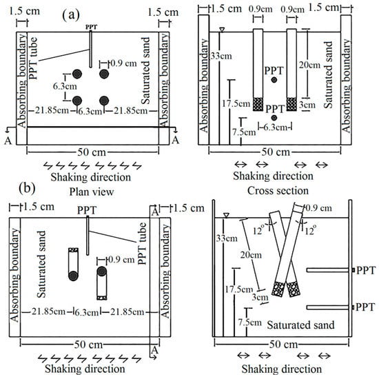 Considerable studies have been performed to investigate the effect of different parameters on the behavior of piles/micropiles based on numerical approaches and experimental studies [23,26,27,31,32,33,34,35,36,37,38,39,40,41,42,43,44,45,46,47,48,49,50,51,52]. The FOREVER (2003) [24] program also showed better performance of battered micropile-reinforced soil against liquefaction. Enhanced performance of inclined micropiles in seismic conditions was also proved in subsequent studies [27,33,34,35,39,53,54]. In addition, these investigations indicated the positive effect of the micropile groups with an increasing number of micropiles on their seismic response [33,35,36,39]. Considering the kinematic interaction, the displacement of the micropiles is very close to the soil-free field movement due to the flexibility of micropiles [25]. Analyzing the seismic response of micropiles considering the kinematic interaction between the micropile and loose saturated soil using a three-dimensional finite element program illustrated the negligible effect of one micropile to reduce the liquefaction. Moreover, a reduction in the soil stiffness caused by the excess pore water pressure generation was reported [33]. Shahrour and Juran (2004) [25] investigated the liquefaction potential of loose saturated sands using centrifuge tests considering the effects of the kinematic interaction. It was shown that the application of micropiles decreased soil movements and the subsequent pore water pressure generation, resulting in an increased soil resistance against liquefaction [25]. Mitrani and Madabhushi (2005) [34] performed a series of centrifuge tests considering the micropiles–soil–structure interaction. As reported, the inclined micropiles, by transmitting the acceleration to the soil surface, caused an excess shear and dilation in the sand around the micropiles, and a significant settlement occurred. In the conducted study, to simulate the effects of the soil–grout bonding, sand particles were glued along the outer length of the pile and the local compaction was created in the soil around the pile to produce confining effects. As surveyed, there have been few studies carried out to evaluate the efficiency of grout-injected micropiles in soil improvement. The research of Moayed and Naeini (2012) [37] using Standard Penetration Tests (SPT) and Plate Load Tests (PLT) showed that the bearing capacity and the soil liquefaction potential increase after the installation of micropiles. On the other hand, Mc Manus et al. (2005) [27], using the shaking table tests, which are widely applied in the literature for the modeling of different problems in the earthquake geotechnical engineering field [30,46,53,55,56], reported the positive effects of two grouted inclined micropiles with increasing the soil resistance to the liquefaction by estimating the cyclic shear strains in the dry sand. Various studies performed on the effects of different boundary conditions showed the major effect of the container on the seismic response of soils [57,58,59]. Considering the inappropriate effects of the rigid lateral boundaries [60,61], artificial boundaries are generally used as absorbing boundaries to reduce the reflected and generated waves caused by the lateral boundaries of the box [62,63,64]. In recent years, the effects of different artificial boundaries such as duxseal materials, sponge, foam, and rubber sheets have been investigated on the seismic response of the soil [62,63,64,65,66]. Hasheminezhad et al. (2022) [22], as one of the most recent studies, applied an absorbent layer of the foam in a rigid-box shaking table to evaluate the effects of two retrofitting methods of wall-type gravel and rubber drains on the liquefaction mitigation and studied the generated excess pore water pressures as a measure for such a purpose.