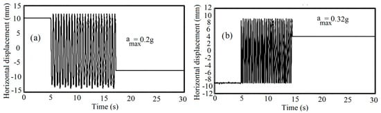 Horizontal displacement of the tank: (a) amax = 0.2 g; (b) amax = 0.32 g.