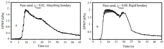 Time histories of EPWP at the bottom PPT: (a) absorbing boundary; (b) rigid boundary.