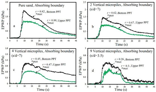 EPWP time histories subjected to 0.2 g acceleration: (a) pure sand; (b) 2 micropiles; (c) 4 micropiles; (d) 9 micropiles.