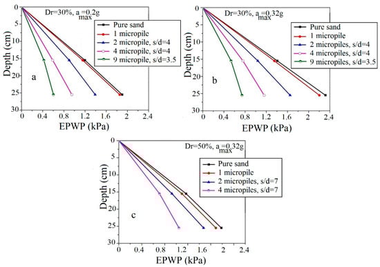However, the effect of a single micropile on the reduction in the liquefaction potential is negligible. Such a result (low impact of a single micropile on the liquefaction potential) was also observed in previous numerical or experimental studies [27,33]. The variation of pore water pressure in depth is shown in Figure 11.