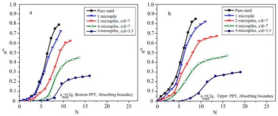 Variation of ru with the cycle number to rumax in different arrangements of micropile: (a) bottom PPT; (b) upper PPT.