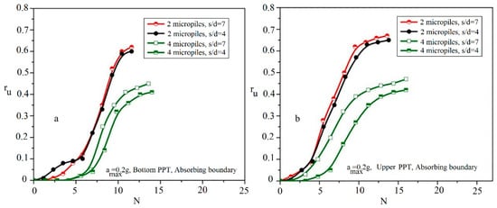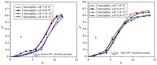 Effects of micropiles’ inclination on variation of ru relative to the applied cycles in different micropiles’ spacing ratios: (a) bottom PPT; (b) upper PPT.