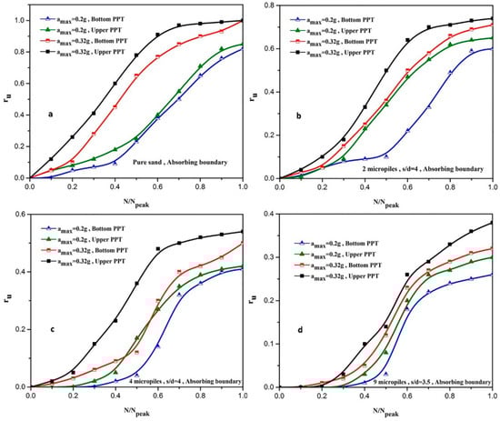 Effect of the scaled loading acceleration on ru values during shaking: (a) pure sand; (b) 2 vertical micropile; (c) 4 vertical micropiles; (d) 9 vertical micropiles.