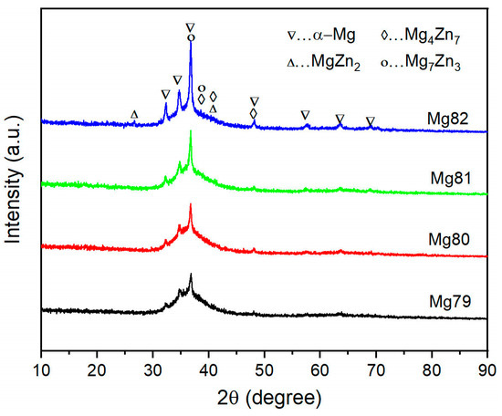 Figure 1 shows the XRD patterns of the as-prepared samples. All patterns are composed of a diffuse peak and several sharp crystalline phase diffraction peaks. The diffuse peak comes from the amorphous structure, indicating that all samples contain a certain amount of amorphous phase. The crystalline diffraction peaks can be divided into two groups: Mg and Mg-Zn intermetallic. For the Mg groups, the diffraction peak angle is highly consistent with the primary α-Mg dendrite phase in reported Mg-based MGMCs [27,28]. It is suggested that the as-prepared samples with different Mg content all contain α-Mg dendrite. The intensity of α-Mg peaks in the XRD pattern increases with the increase in Mg content, indicating that the addition amount of Mg significantly affects the volume fraction of the primary α-Mg crystalline phase. For the Mg-Zn intermetallic compounds, the diffraction peaks are much lower, which are generally hidden and interfered with by background noise. Furthermore, the common Zn-rich intermetallic compounds in the Mg-Zn alloy system, such as Mg7Zn3, Mg4Zn7 and MgZn2, have similar diffraction peak angles, so it is difficult to accurately distinguish them through the XRD patterns in this work. According to the reported XRD analysis of Mg-Zn phases in the literature [29,30,31,32], it can be inferred that the intermetallic phase in the Mg79-Mg82 sample may be a mixture of Mg7Zn3, Mg4Zn7 and MgZn2 phases. In addition, the diffraction peak of α-Mg in sample M82 is significantly higher than that of Mg−Zn compounds, which implies that the amount of crystalline phase α-Mg is significantly higher than the other crystalline phases.