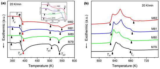 In order to further confirm the presence of the MG phase, the DSC test is performed on the powder samples. The inset of Figure 2a shows a partially enlarged view of the low temperature range marked by the dotted box, which indicates that all samples have the characteristics of a glass transition at about 350 K. It is suggested that there is a certain amount of glassy phase in the samples, which is in good agreement with the XRD result shown in Figure 1. When the temperature rises above 370 K, three exothermic peaks appear on the DSC curves of the four samples, which are labeled as Tp1, Tp2 and Tp3, as shown in Figure 2a, respectively. These exothermic events can be attributed to the complex crystallization transformation of the glass phase, which is also considered as a representative feature of the existence of the glassy phase [33,34].
