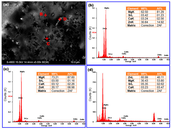 (a) Typical SEM image of an Mg82Zn14Ca3Sr1 MGMC sample; (b–d) EDS results of point B, C and D as marked in (a).