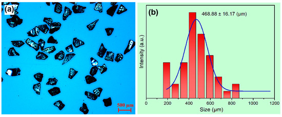 The azo dye degradation efficiency of the MgZn-based MG alloy is significantly particle-size-dependent, according to the reports [14,17]. Therefore, particle size should be precisely measured before determining the azo dye degradation performance for any sample. Figure 4 shows the optical microscopic image and corresponding particle size statistical analysis of sample M82 after sieving between the 80-mesh sieve and the 100-mesh sieve. The particle size after screening fluctuates from ~200 to 850 μm, with an average value of 468.88 ± 16.17 μm, which is much larger than that of ball-milled [5] and gas-atomized [14]. In addition, the particles after grinding have sharp edges and corners, and their geometric shape shows the characteristics of irregular shape, which is consistent with the fracture of brittle materials. It is known that the properties of MG alloys and MGMC materials are obviously affected by various conditions such as thermal history [37,38], oxidation [39,40,41], and residual stress [42,43,44], etc. Relatively, large particles are less affected by the heating change, oxidation and other conditions due to low specific surface area. Therefore, the azo dye degradation performance tested with large particle samples is closer to its intrinsic degradation property than that of very small particle samples. The development of high-efficiency azo dye degradation materials with a large sample size is of great significance to the stability of the azo dye degradation performance and a long period of validity of sewage treatment agents.