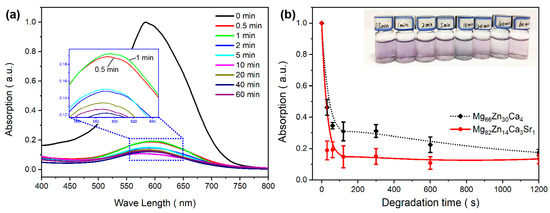 (a) Absorption spectra of the M82 sample after immersing in DB6 solution for different times; (b) comparison of the degradation curves of the Mg82 sample and Mg66Zn30Ca4 MG alloy under similar particle size, with an inset showing the macroscopic optical photos of the DB6 solution degraded by using M82 at different times.