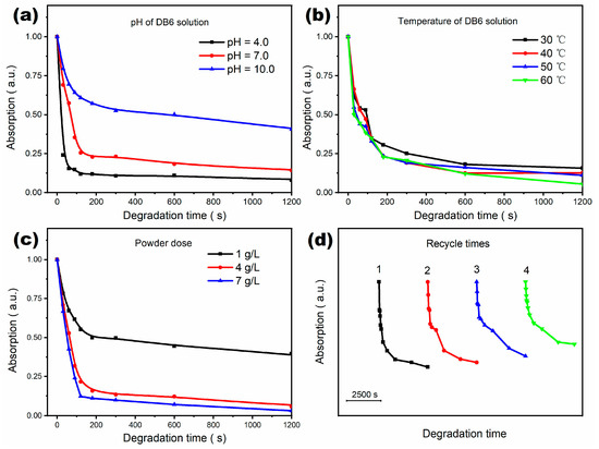 Degradation curves of Mg82 under different conditions of: (a) pH of DB6 solution; (b) treatment temperature; (c) dose; (d) recovery time.