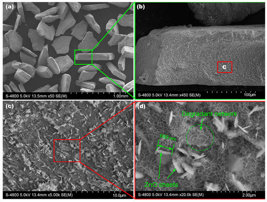 Figure 7 shows the typical SEM images of the Mg82 MGMC sample after DB6 degradation for 1 h with different magnifications. After reacting with the DB6 solution, the shape and size of the M82 particle have no obvious change, as shown in Figure 7a. It is implied that the sample powder has no obvious consumption in the degradation reaction. However, through the highly magnified SEM images displayed in Figure 7b–d, it can be clearly seen that there are significant changes to the surface morphology of the sample: (1) some white sheet products stand upright on the substrate (Figure 7c); (2) the surface is covered by a light gray network (Figure 7d). The white sheet products have a size of ~700 nm and a thickness of ~5 nm, which are generally considered to be ZnO or Zn(OH)2 deposits inferred from morphology. This is a common phenomenon in the azo dye degradation process of Mg-Zn-Ca MG alloy [5,20]. For the light gray network pattern, it can be found in different MG systems used for azo dye degradation [50,51,52], which is generally considered to be the degradation product of the reaction between dye molecules and the surface metal.