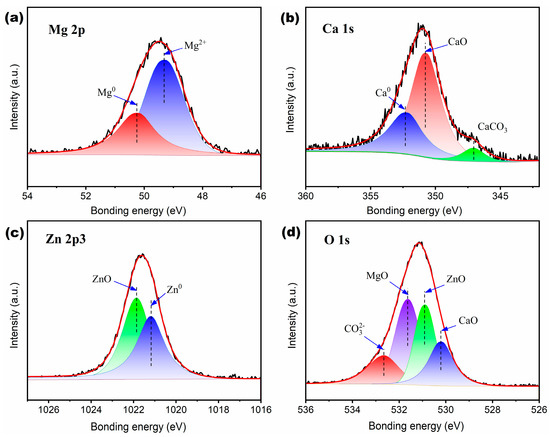 Figure 8 shows the XPS spectrum analysis of the recovered M82 powder after the azo dye degradation experiment. Figure 8a shows that the Mg 2p peak can be decomposed into two peaks with different bonding energy of 49.3 and 50.2 eV, corresponding to Mg2+ and Mg0, respectively. The peak height of Mg2+ is about twice that of Mg0, which indicates that after soaking in DB6 solution for 1 h, Mg atoms on the surface of M82 particles form bivalent Mg deposits, such as MgO, Mg(OH)2 or MgCO3. It should be noted that the existence of the Mg0 peak implies that the surface metal of the particle still has the ability to degrade azo dyes, agreeing well with the results shown in Figure 6d. Figure 8b shows that the Ca 1s peak can be decomposed into three peaks with different bond energies, namely 347.0, 350.7 and 352.3 eV, corresponding to CaCO3, CaO and Ca0, respectively. It is very intuitive that the CaO peak is higher than CaCO3 and Ca0, which means that the sample surface contains a large amount of CaO. Considering that the XPS sample has undergone vacuum drying treatment, which may lead to the decomposition of hydroxide, these CaO may also come from the decomposition of Ca(OH)2. In addition, carbonate ions CO32− may come from the decomposition of DB6 molecules or the dissolution of CO2 in solution. Figure 8c shows that the Zn 2p3 peak can be decomposed into two peaks with similar bonding energies, 1021.2 and 1021.9 eV, corresponding to Zn0 and Zn2+, respectively. Compared with Mg and Ca, Zn is more stable in an aqueous solution, resulting in more Zn0 remaining on the surface of the M82 sample after the 1 h azo dye degradation test. Figure 8d shows that the O 1s peak can be decomposed into four peaks with different bonding energies, 530.2, 530.9, 531.6 and 532.6 eV, corresponding to CaO, ZnO, MgO and CO32− respectively. Among these peaks, the peak heights of MgO and ZnO are significantly higher than other peaks, indicating that the degradation products on the surface of the M82 sample are mainly composed of MgO and ZnO.